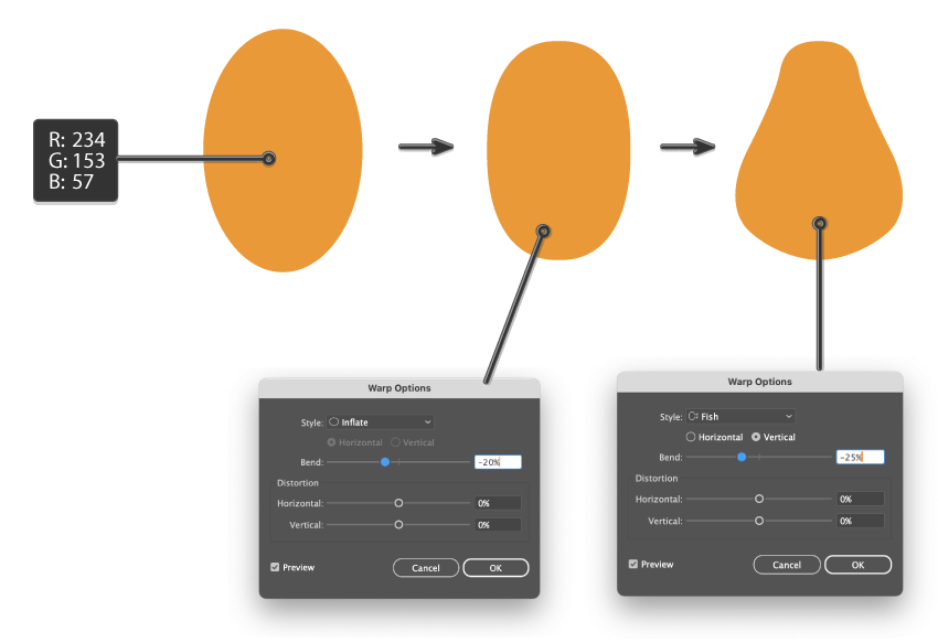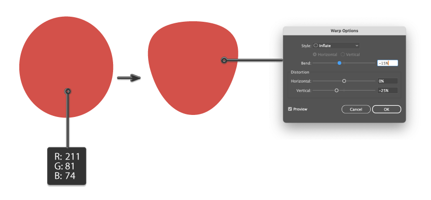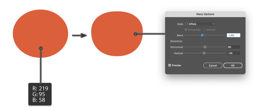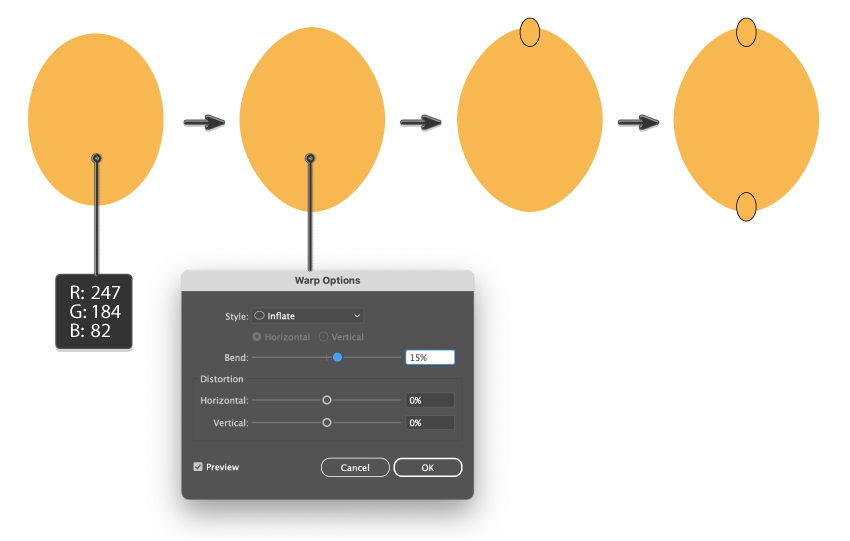 - وقتی بیضی رو انتخاب کردی، برو به مسیر Effect > Warp > Inflate. توی پنجرهای که باز میشه، تنظیماتی که توی آموزش داده شده رو وارد کن و OK رو بزن.