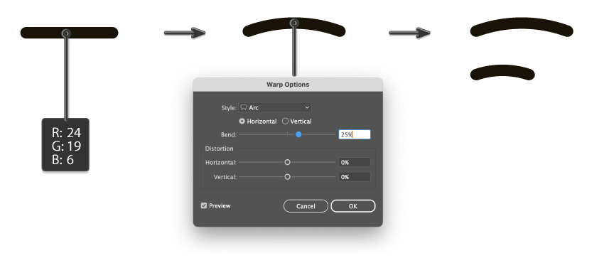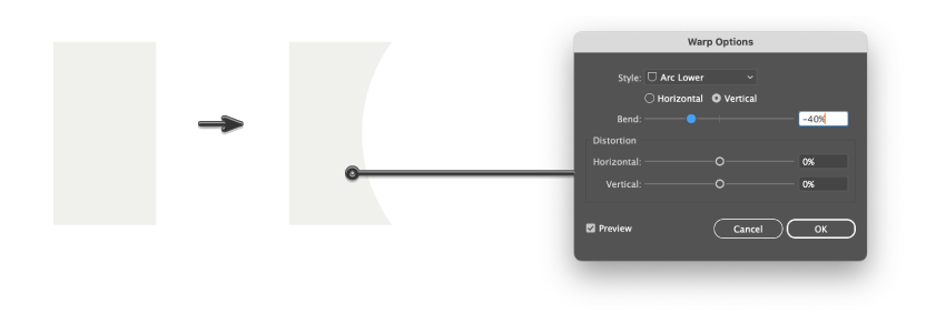 • وقتی مستطیل انتخابه، برو به: Effect > Warp > Arc، گزینه‌ها رو طبق تصویر وارد کن و OK رو بزن.