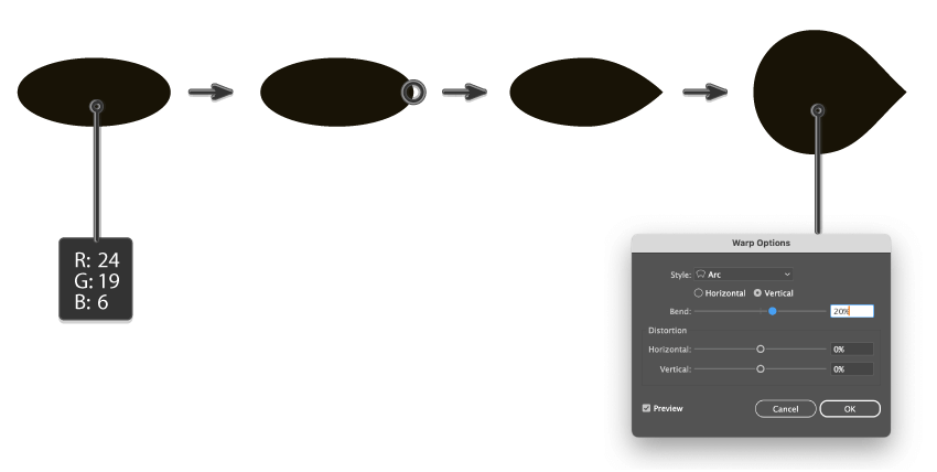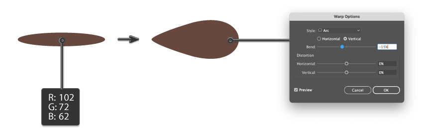 • بعد برو به Effect > Warp > Arc. توی پنجره Warp Options، گزینه‌ها رو طبق تصویر وارد کن و OK رو بزن. این می‌شه انگشت بلندتر روبین.
