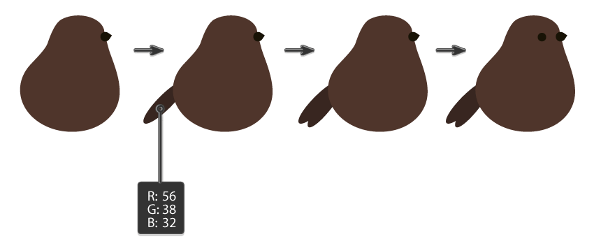 • برای چشم فقط یه دونه لازمه، چون فقط یک سمت پرنده دیده می‌شه. با Eyedropper Tool (I) رنگ Fill رو از منقار بگیر و یه دایره کوچک به عنوان چشم بکش.
