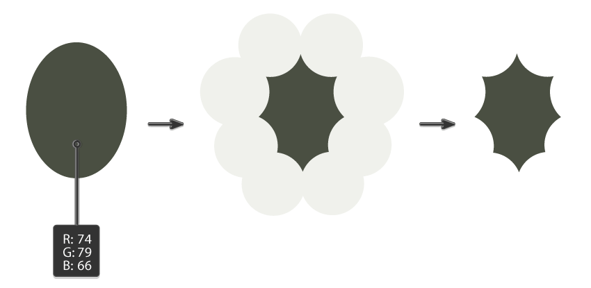 • حالا بیایم برگ هالی رو بسازیم. یه بیضی بکش (Fill: R=74, G=79, B=66).