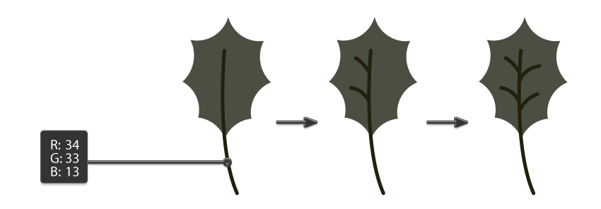 • حالا ساقه برگ هالی رو بسازیم. مطمئن شو که برگ انتخاب نیست، بعد Swap Fill and Stroke (Shift-X) رو بزن و رنگ Stroke رو بذار روی: R=34, G=33, B=13.
