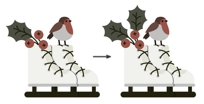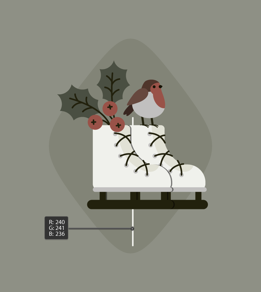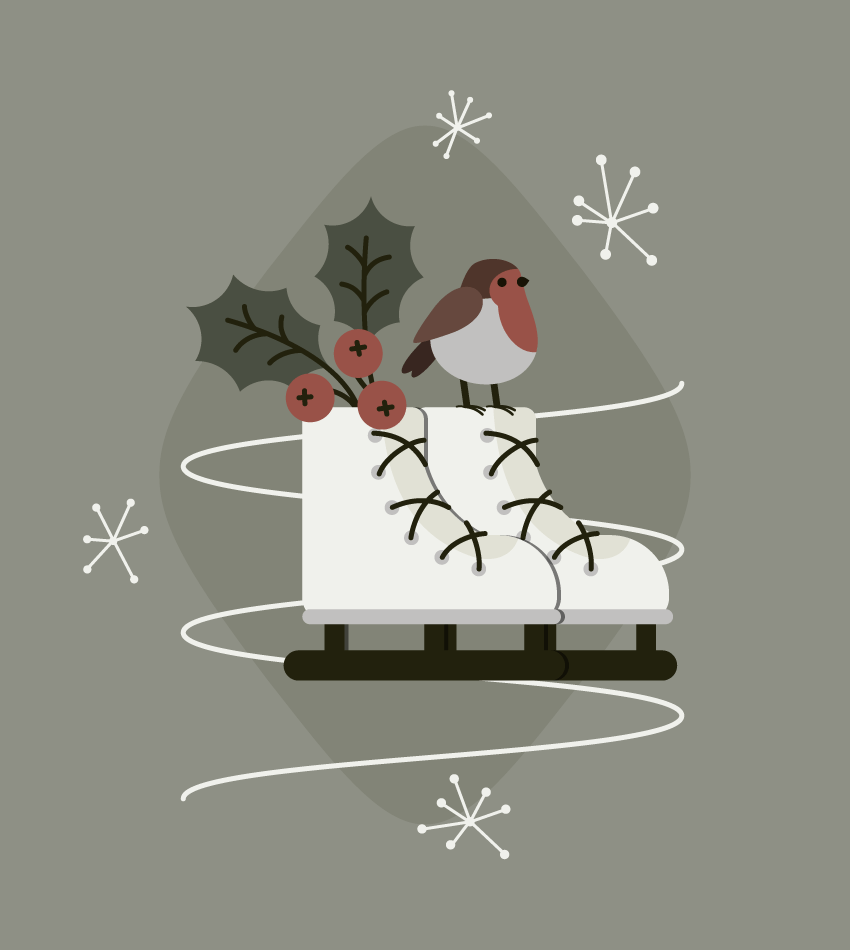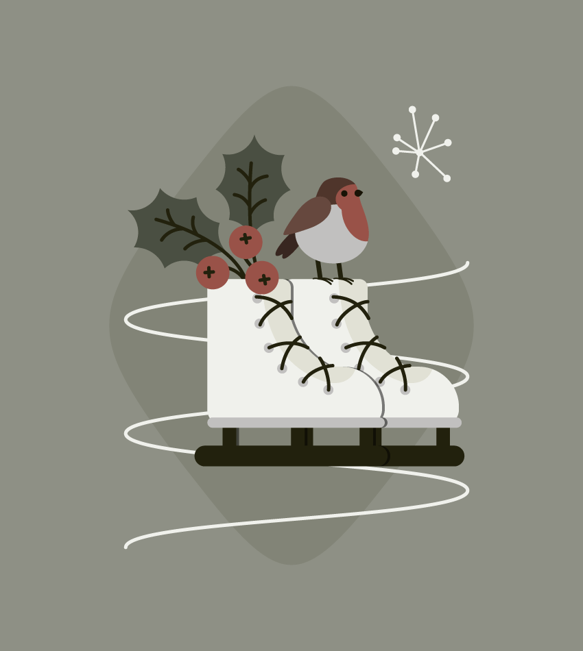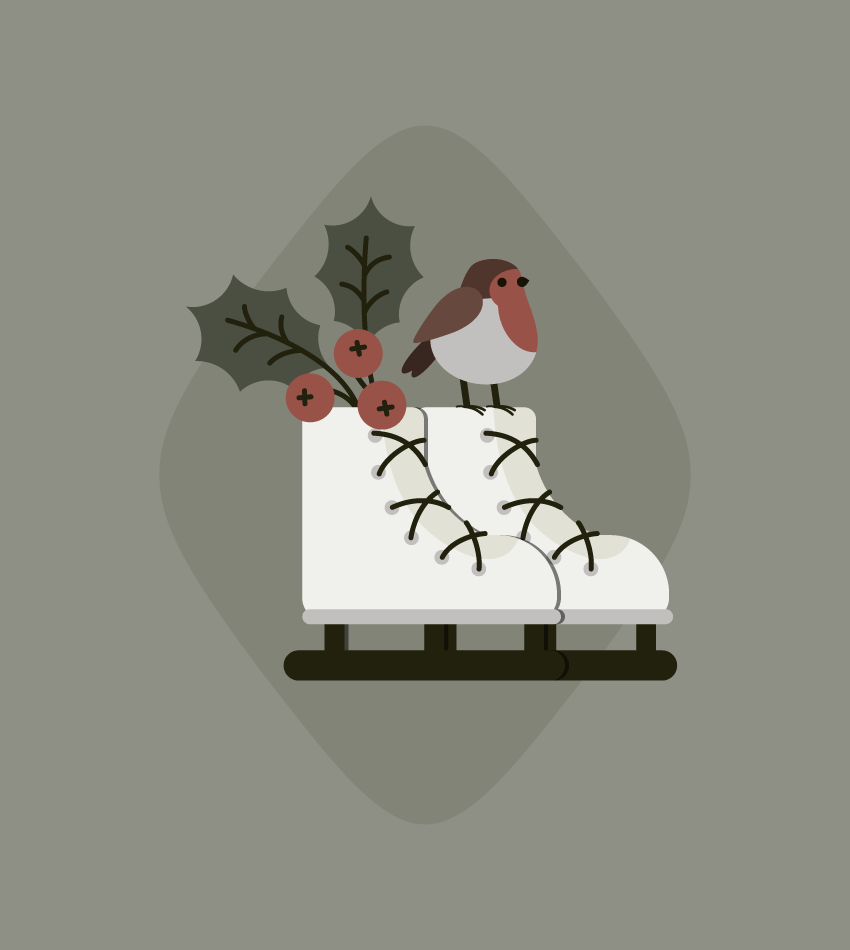 اسکیت‌ها، روبین و توت‌های هالی همراه با برگ‌ها رو روی پس‌زمینه قرار بده.
