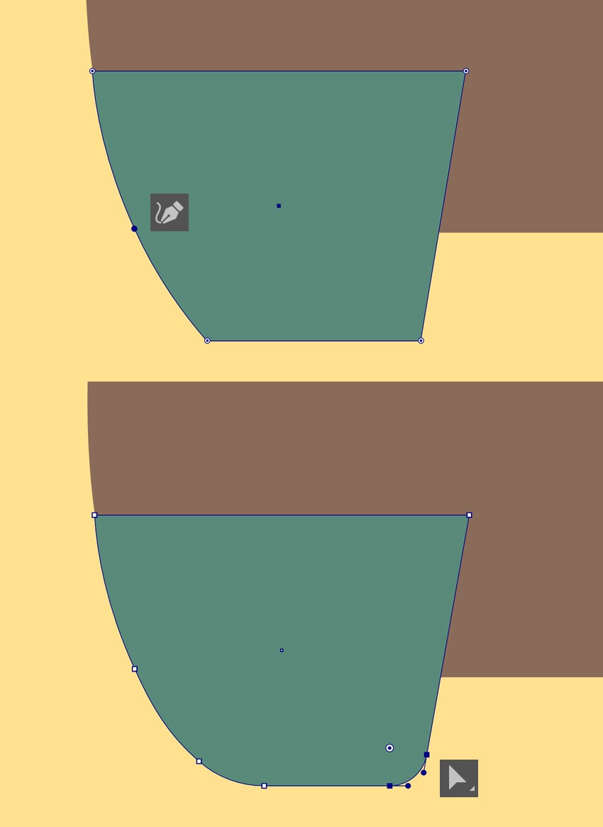 حالا بیایم شکل بدن رو طوری دربیاریم که پایینش پهنتر باشه. برای این کار، ابزار Direct Selection Tool (A) رو بردار و نقطهی گوشهی پایین سمت راست مستطیل رو انتخاب کن.