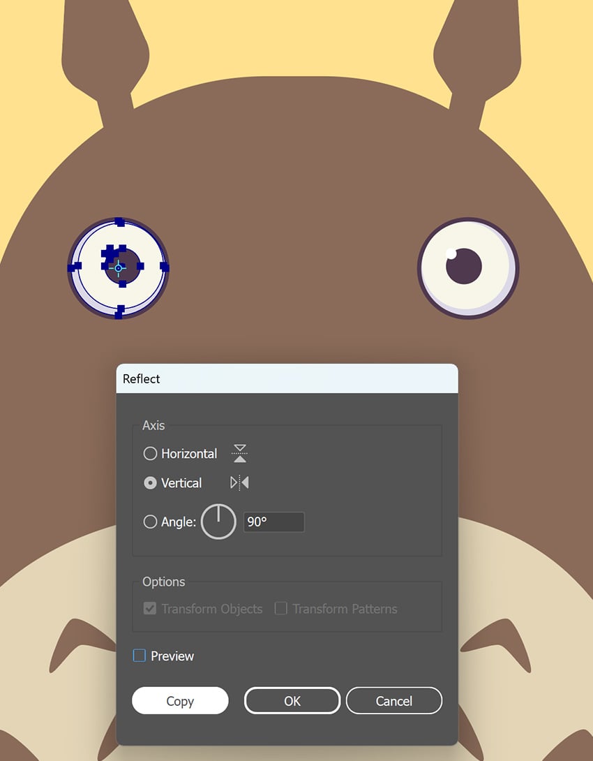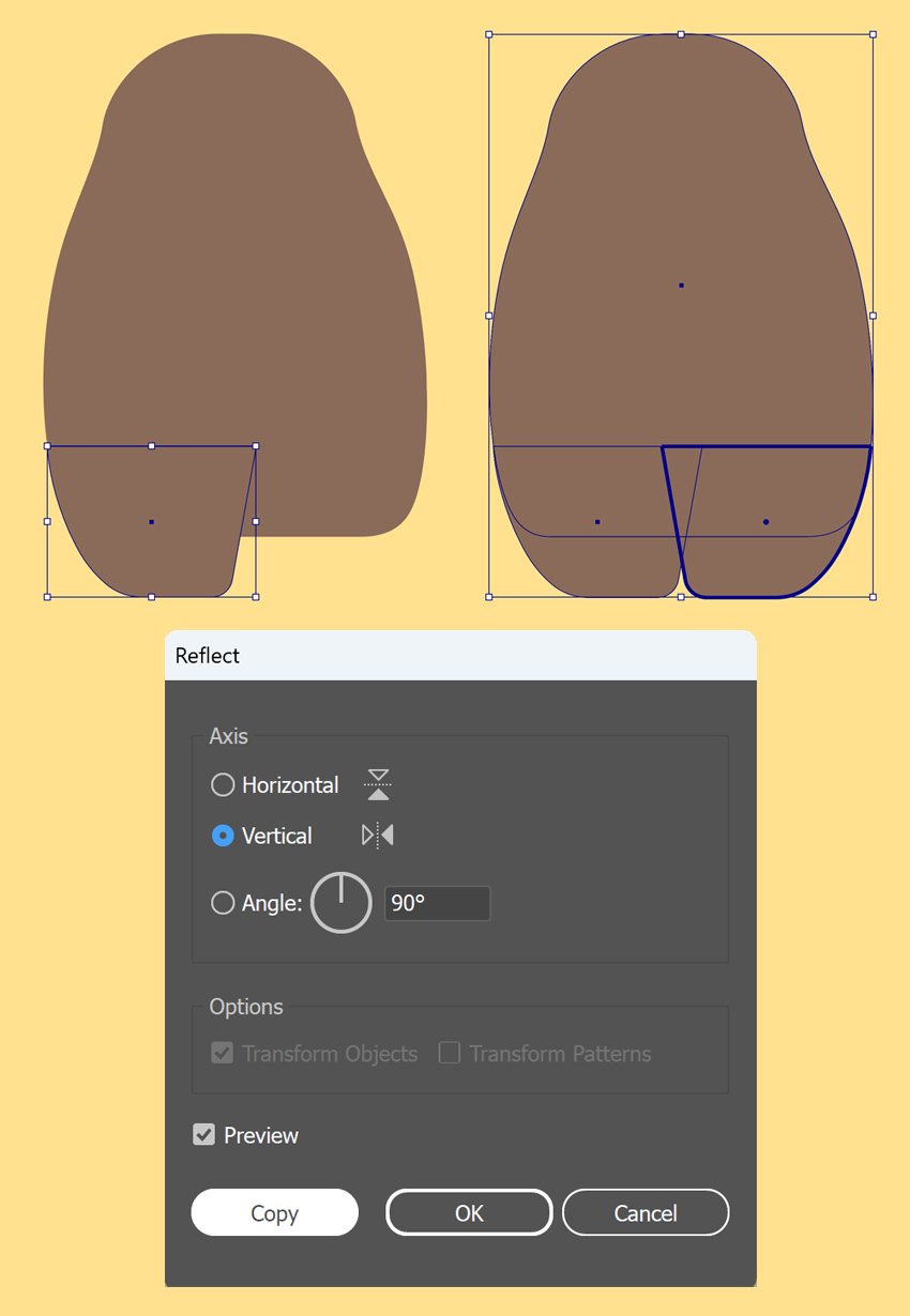 با Eyedropper Tool (I) رنگ بدن توتورو رو روی شکل پا اعمال کن. بعد با Reflect Tool (O) یه کپی آیینهای بساز. ابزار Reflect Tool (O) رو دوبار کلیک کن، تو پنجرهی بازشده Vertical Axis رو انتخاب کن و روی Copy کلیک کن.