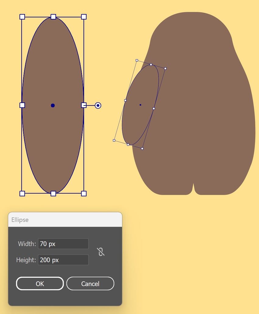 حالا علامتهای روی سینهی توتورو رو اضافه میکنیم. با Ellipse Tool (L) یک بیضی کوچک ۴۰ × ۱۰ پیکسل رسم کن.