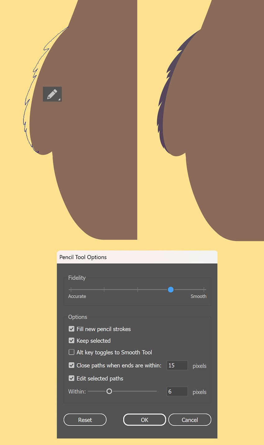 حالا میخوایم به بدن توتورو بافت خز بدیم تا طبیعیتر به نظر بیاد. Pencil Tool (N) رو انتخاب کن. قبل از کشیدن، تنظیمات ابزار رو با دوبار کلیک روی آیکون Pencil Tool باز کن: