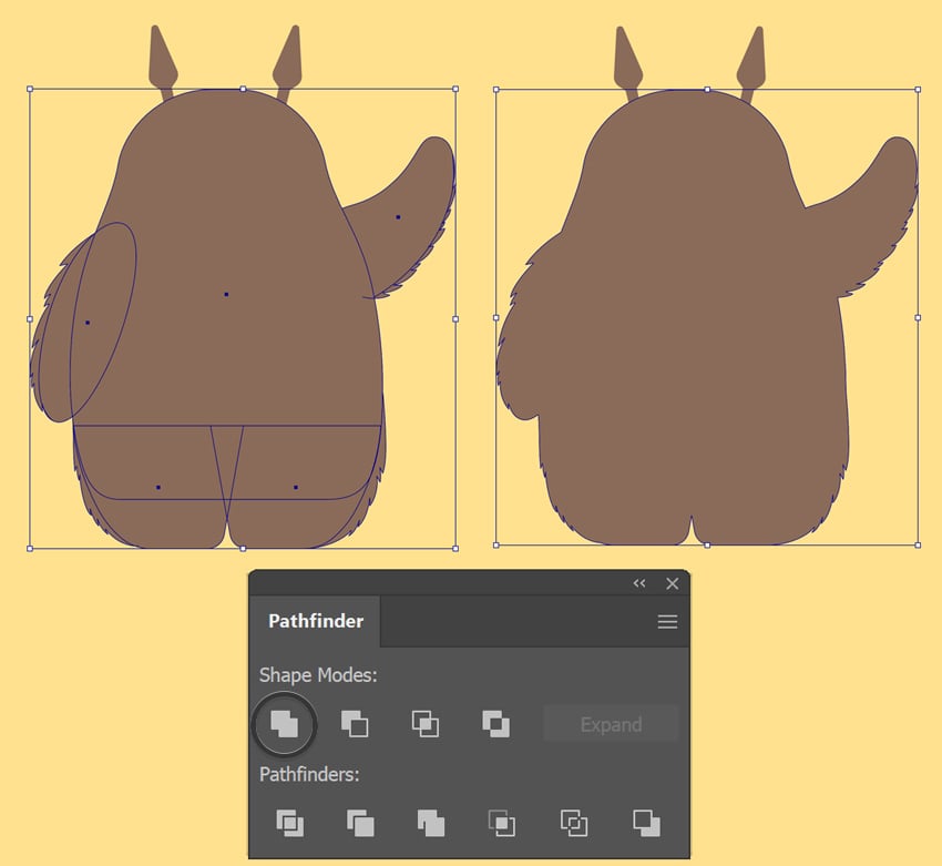 بعد از اینکه خز رو کشیدی، وقتشه همهی بخشهای بدن رو با هم ادغام کنیم. همهی قسمتهای بدن رو انتخاب کن، شامل خز ولی به جز گوشها. پنل Pathfinder رو باز کن و روی Unite کلیک کن تا همهی بخشها به یک شکل واحد تبدیل بشن.