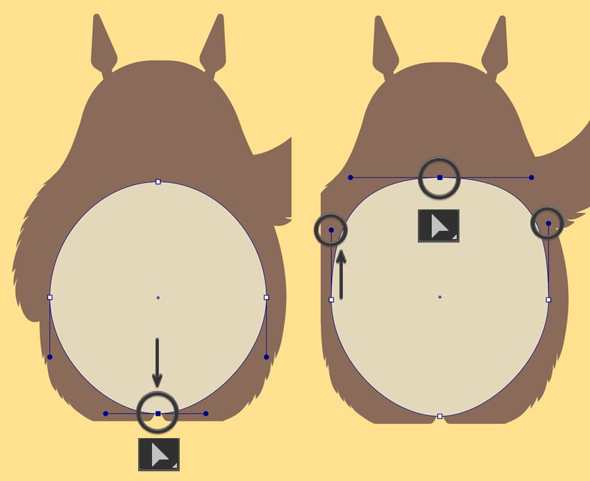 حالا دایرهی شکم رو کمی شبیه تخممرغ کنیم. با Direct Selection Tool (A) نقطهی پایین دایره رو بگیر و کمی پایین بکش تا شکم کشیدهتر بشه.
