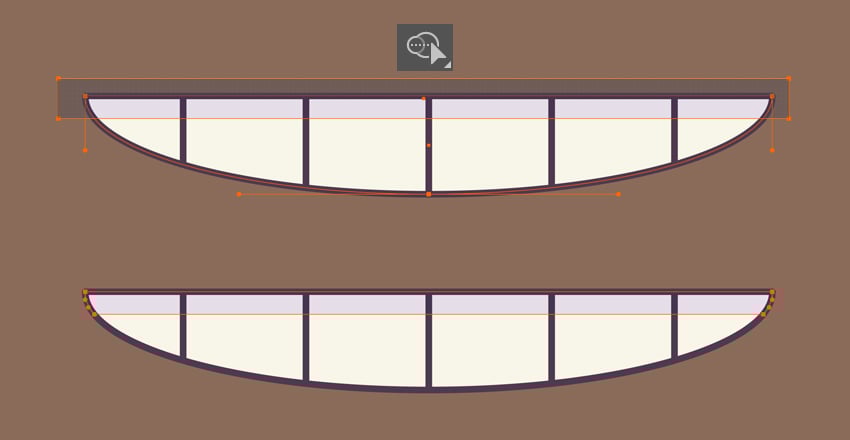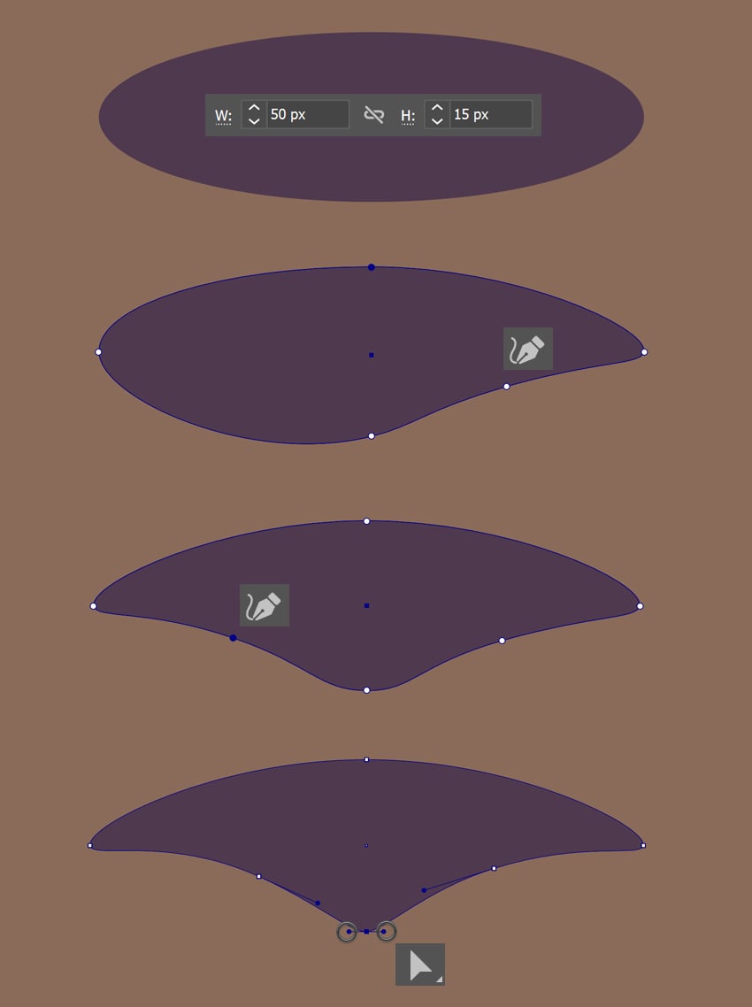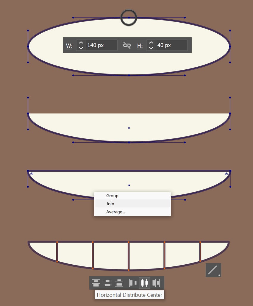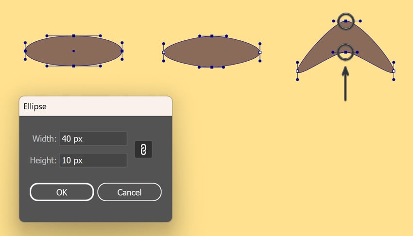 - با Direct Selection Tool (A) نقطه بالای بیضی را انتخاب کرده و با Delete یا Backspace حذف کن.