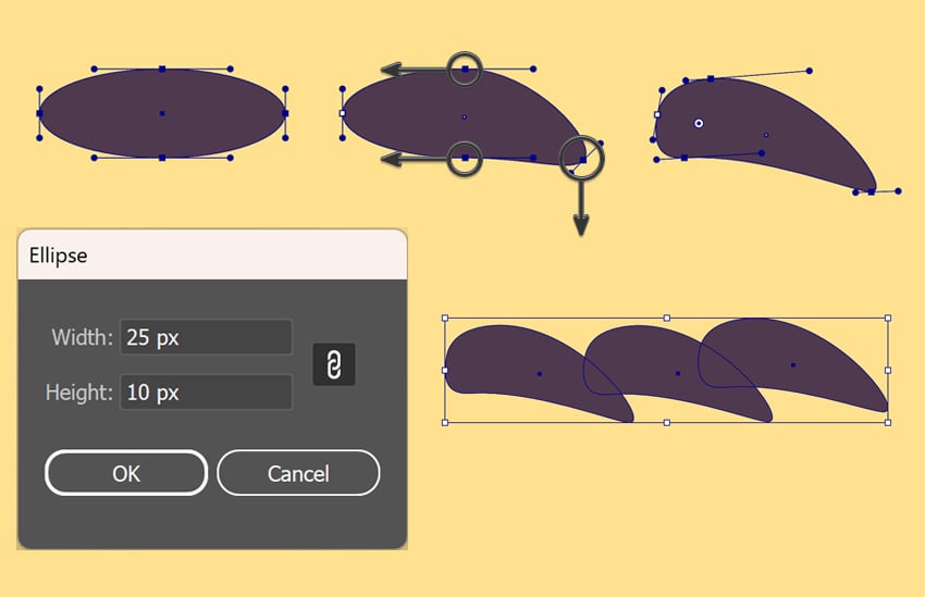 - با Direct Selection Tool (A)، نقطه پایینی کپی را کمی به پایین بکش تا شکل کمی کشیدهتر شود.