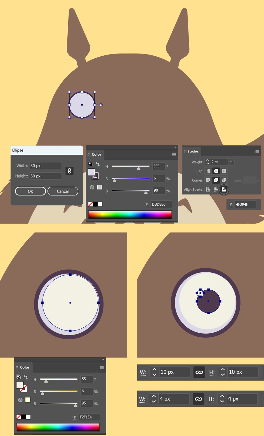 - دو دایره کوچکتر با رنگ تیره برای مردمکها اضافه کن و موقعیت آنها را تنظیم کن تا دوده حالت بامزه پیدا کند.