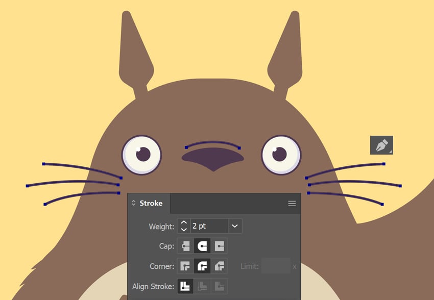 - برای جزئیات بیشتر، یک خط کوتاه و خمیده بالای بینی با Pen Tool بکش و Stroke Weight آن را با سبیلها یکسان تنظیم کن.