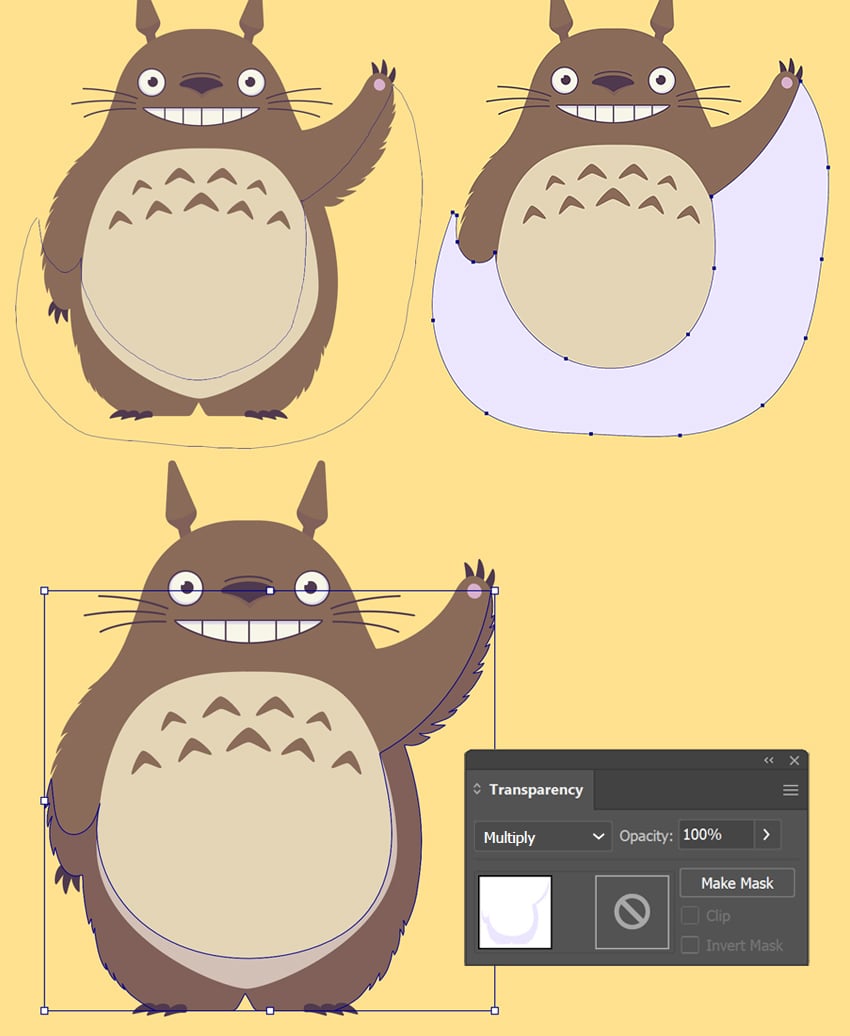 - در Transparency panel، حالت Multiply را برای شکل کپی انتخاب کن تا با بدنه ترکیب شود و یک سایه ملایم ایجاد کند.