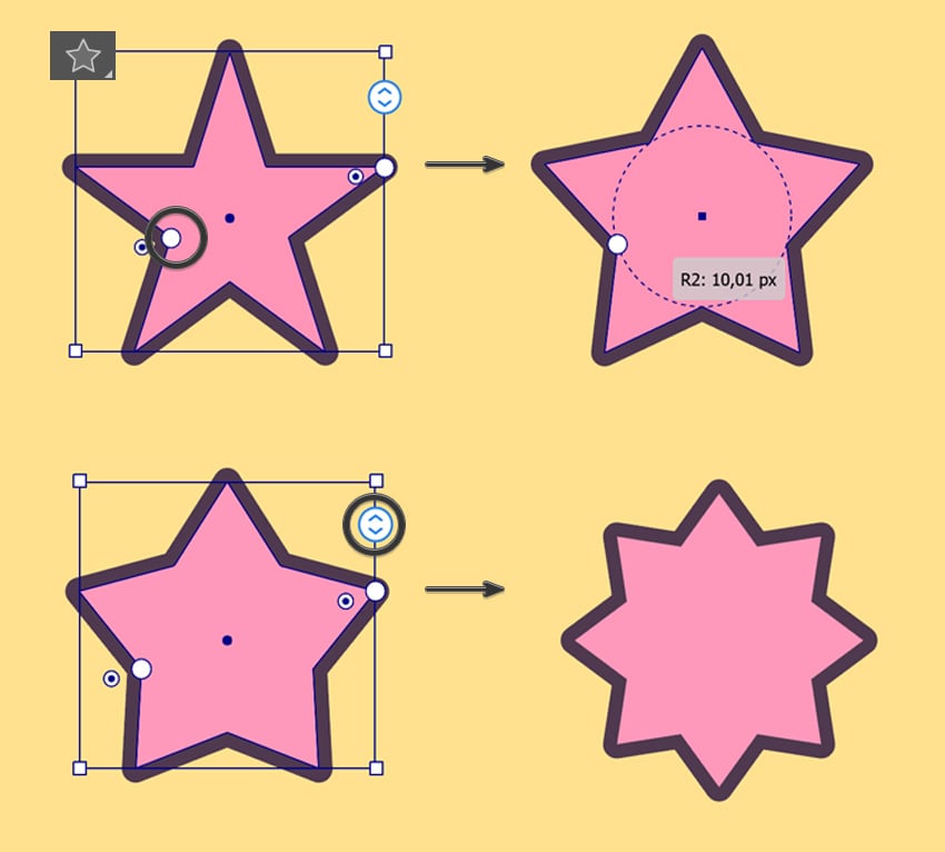 - ستاره را انتخاب کرده و با دایرهی کوچک سفید روی ستاره، Inner Radius را تنظیم کن تا نوک ستاره تیز یا کمی گرد شود.