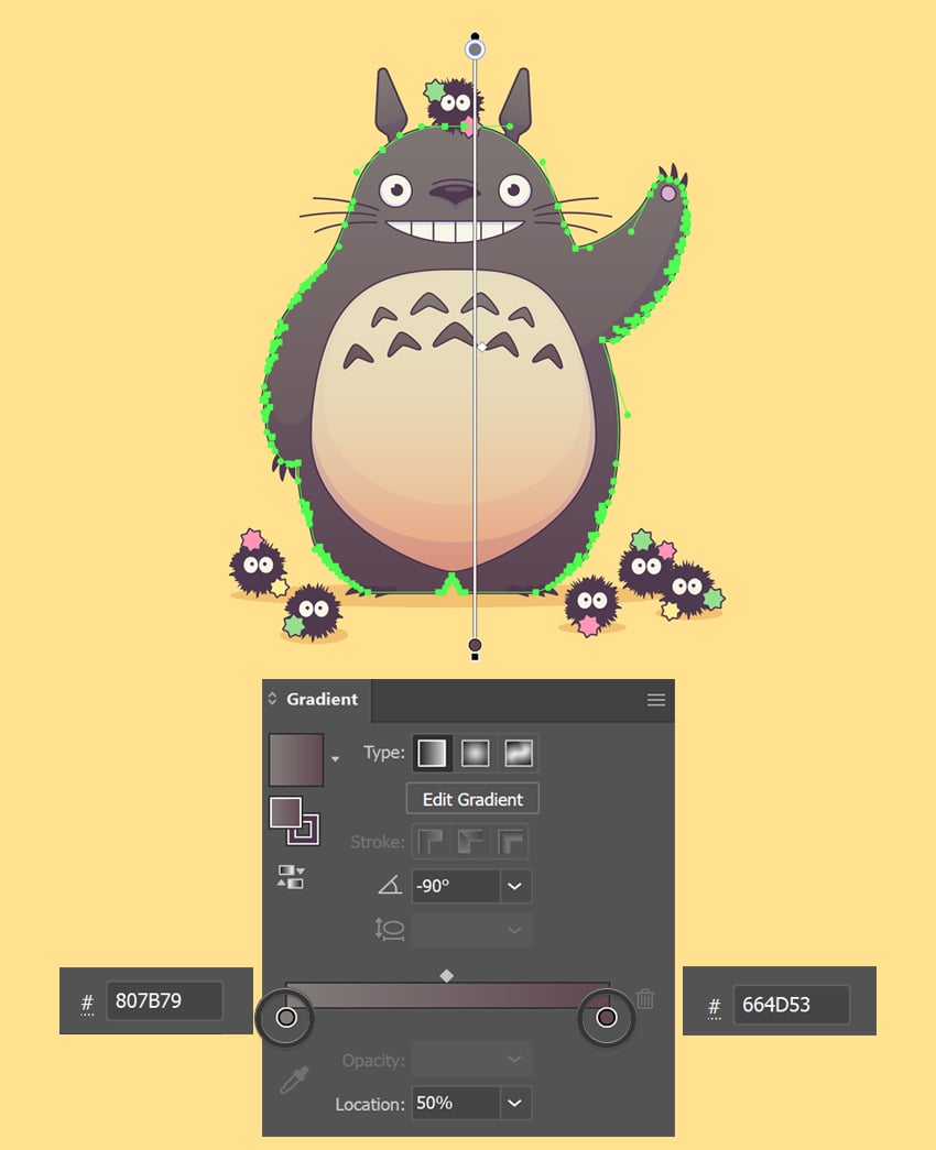 - برای ایجاد حجم و عمق بیشتر، رنگ بدن توتورو را با یک گرادیانت جایگزین کن. بدن توتورو را انتخاب کن و پنل Gradient را باز کن (Window > Gradient).