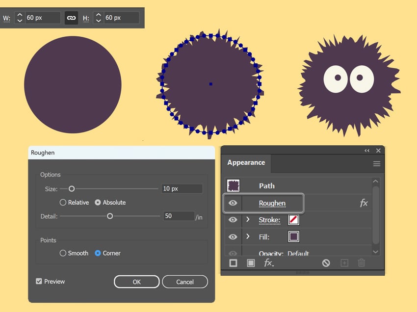 - دایره را انتخاب کن و از منوی Effect > Distort & Transform > Roughen استفاده کن تا حاشیهی دوده حالت تیغتیغی پیدا کند.