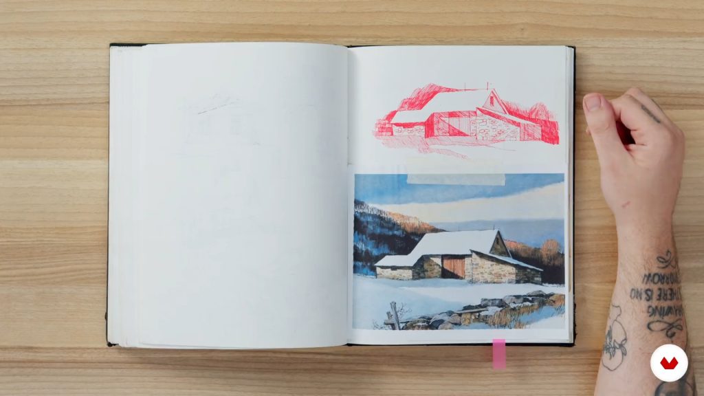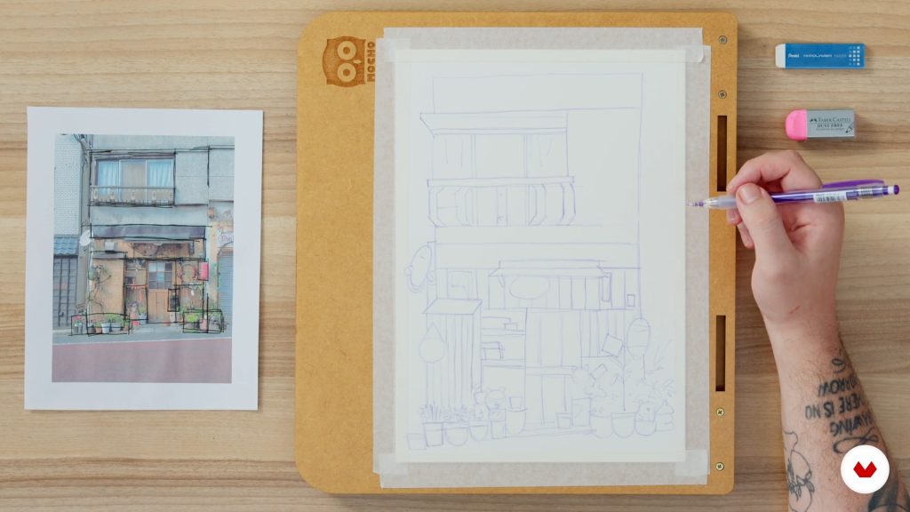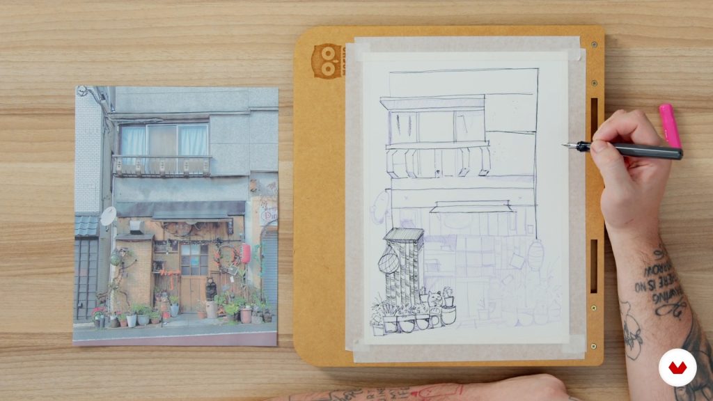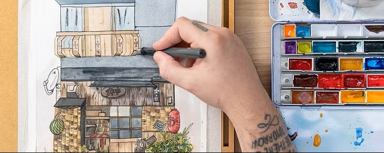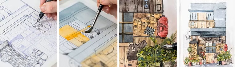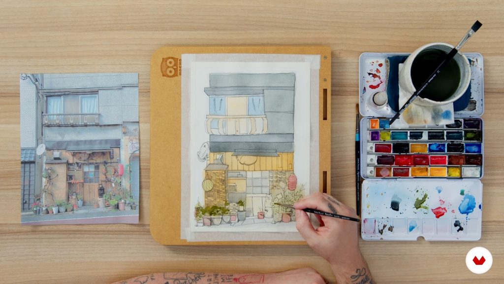 ساخت یک تصویرسازی معماری بر اساس یک عکس مرجع، با استفاده از جوهر و آبرنگ.